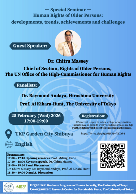Dr. Chitra Massey, Chief of Section, Rights of Older Persons, The UN Office of the High-Commissioner for Human Rights, will discuss the developments, trends, achievements, and challenges in the human rights of older persons. In particular, she will talk about the newly established Inter-Governmental Working Group, which is drafting a new convention on the rights of older persons. Dr. Raymond Andaya from Hiroshima University and Prof. Ai Kihara-Hunt from the University of Tokyo will join the panel discussion. This event is open to the public with prior registration. Priority may be given to UTokyo students if seats are full. Further details will be sent via email to the registrars.
