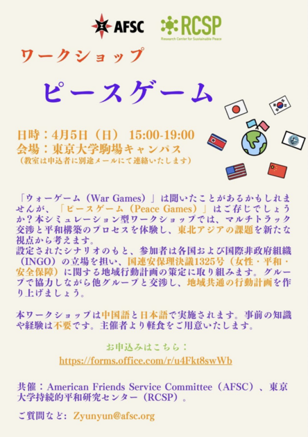 「ウォーゲーム(War Games)」は聞いたことがあるかもしれませんが、ピースゲーム(Peace Games)」はご存じでしょうか?本シミュレーション型ワークショップでは、マルチトラック交渉と平和構築のプロセスを体験し、東北アジアの課題を新たな視点から考えます。
